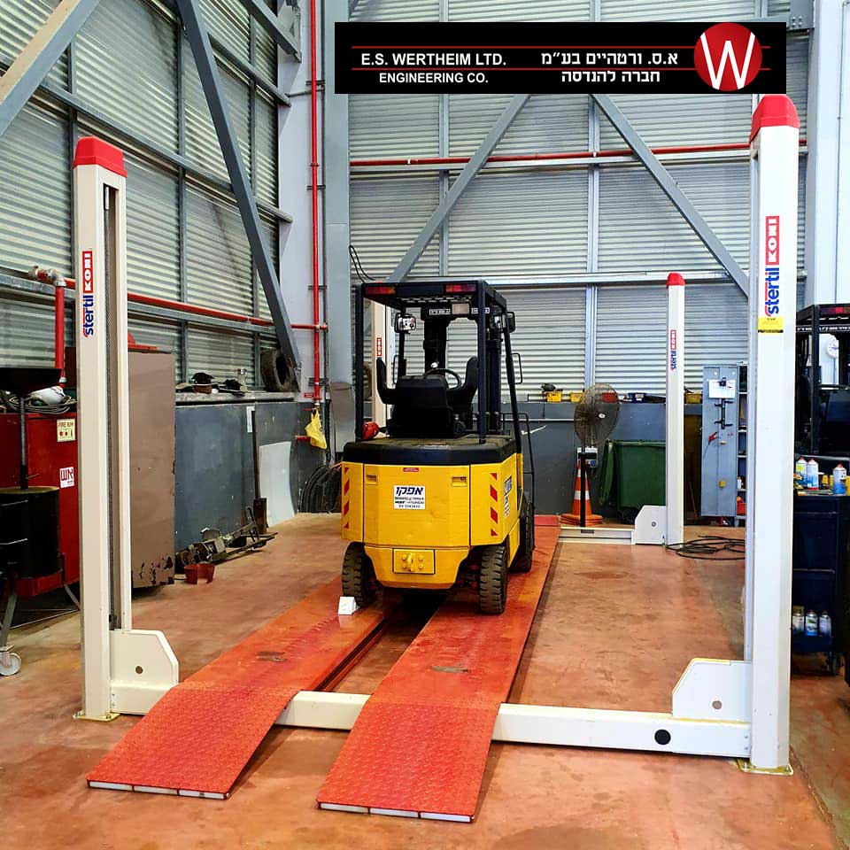 ליפט 4 עמודים בכושר הרמה 4 טון, אורך מסילות 6 מ’ המתאים לכל סוגי הרכבים.